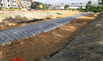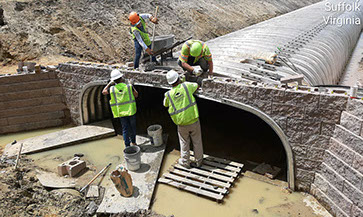 Harbour Towne Wetlands Crossing was a public project for the city of Suffolk located in the booming Harbour View area. We teamed up with a local contractor to provide the E&S controls, clearing, storm drain installation, excavation, grading and backfill compaction for a large arch culvert, roadway and retention walls that was installed over and existing stream.